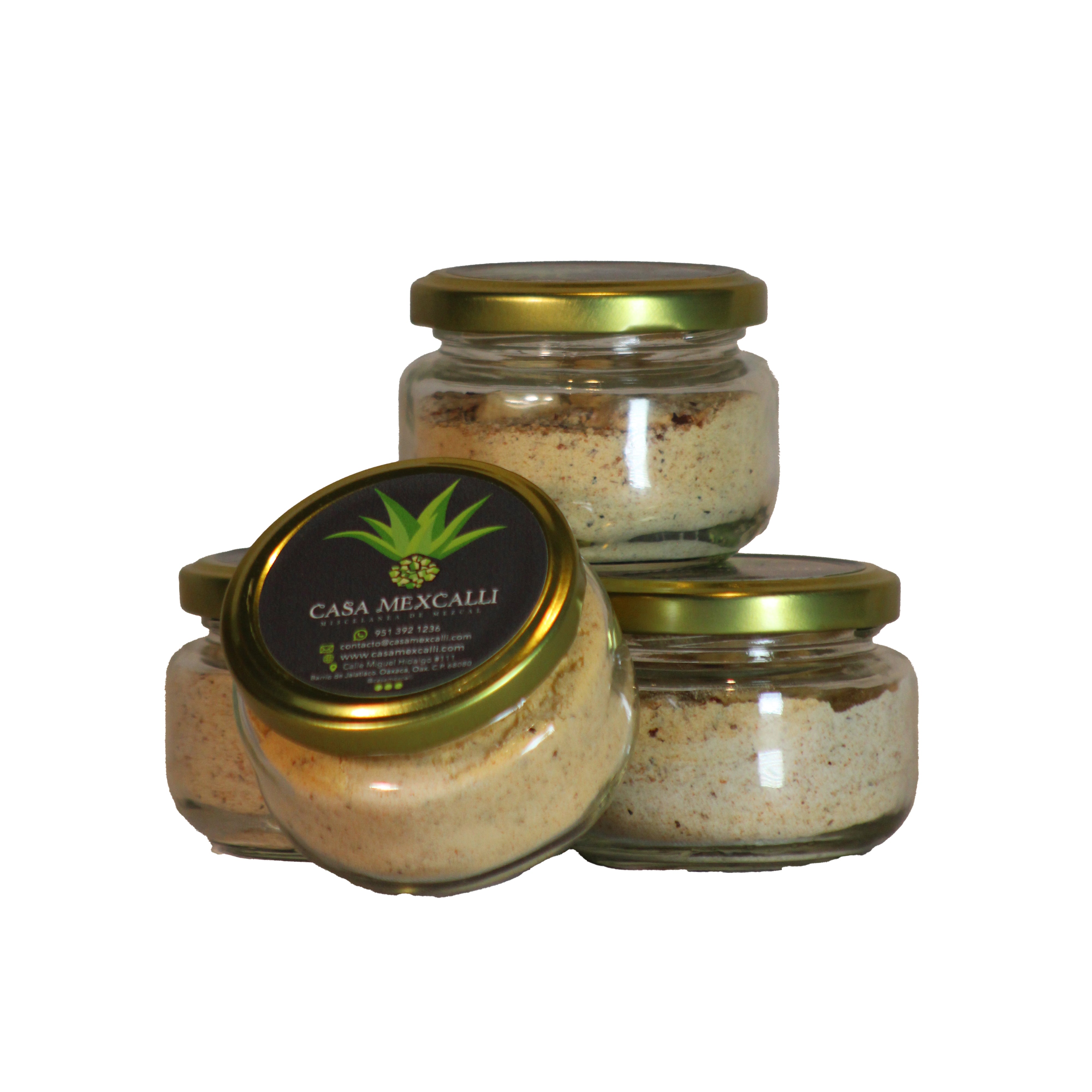 Mezcla ancestral elaborada con sal, chiles secos y gusano de maguey tostado, molidos finamente para lograr un sabor profundo y ahumado. Esta sal tradicional realza el sabor de frutas, cocteles y destilaos como el mezcal, aportando un toque terroso y ligeramente picante.
